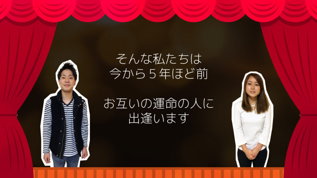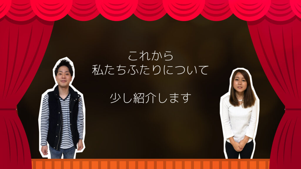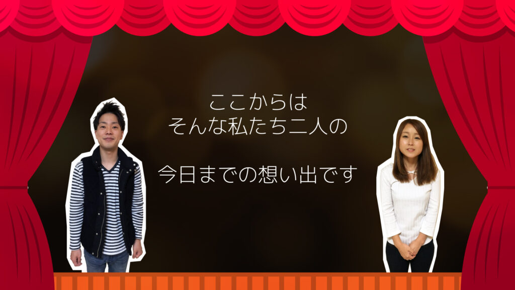 新郎プロフィールシーンで新郎の写真にコメントをする新婦のポーズです。