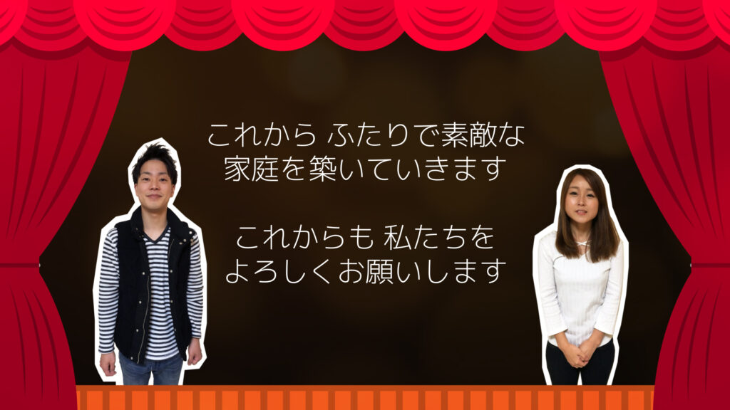 新婦プロフィールシーンで新婦の写真にコメントをする新郎のポーズです。