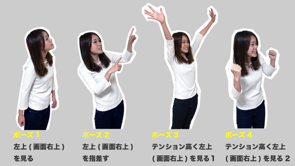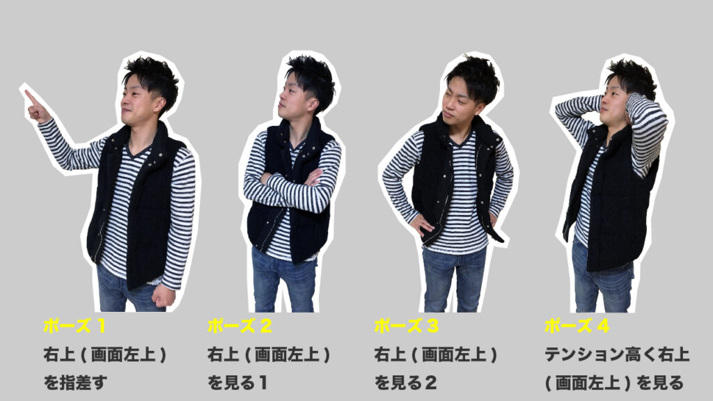 始まりや最後の締めのシーンで使用するので、落ち着いた直立のポーズがオススメです。