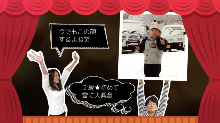 新郎プロフィールシーンで新郎の写真にコメントをする新婦のポーズです。